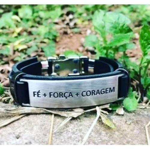 Pulseira Masculina Couro Preto Placa Preta Foco Força E Fé