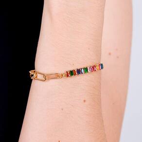 Pulseira banhada a ouro com aplicação de baguetes coloridas é delicada e divertida e que te deixa em destaque em qualquer situação.