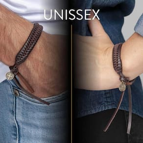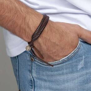 Pulseira Trançada de São Bento, produzida com materiais de qualidade em couro marrom escuro e metais em ouro velho.