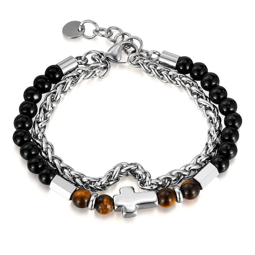 Tamanho: 195+25 mm Peso: 25 g Material: aço inoxidável/Olho de tigre Peça central cruzada icônica — apresenta um símbolo de cruz de aço inoxidável polido para uma expressão ousada de fé e força. Design de camada dupla — combina elos de corrente e fios de miçangas naturais para uma aparência de streetwear dinâmica e em camadas. Olho de tigre e contas pretas — Pedras naturais de olho de tigre misturadas com contas pretas brilhantes proporcionam um forte impacto visual e energia espiritual. Ajuste durável e ajustável — Feito de aço inoxidável com 195 mm de comprimento e extensor de 25 mm, adequado para a maioria dos tamanhos de pulso. Joias masculinas modernas — perfeitas para roupas de hip hop, motociclista ou em camadas, adicionando atitude e personalidade ao uso diário.