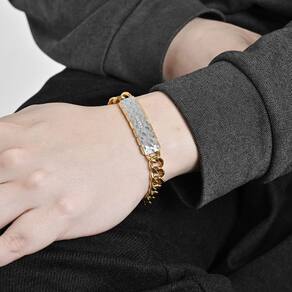 Tamanho: 21 cm Peso: 44 g Material: aço inoxidável Placa exclusiva de textura martelada — apresenta uma barra frontal prateada com acabamento martelado irregular e detalhes em cristal embutidos, criando uma aparência artesanal única. Design contrastante em dois tons — combina textura prateada escovada com uma corrente de elos cubana dourada para contraste ousado e elegância moderna. Construção em aço inoxidável de alta qualidade — Construída em aço inoxidável durável com galvanoplastia a vácuo, oferecendo retenção duradoura de cor e resistência ao desgaste. Fecho de caixa oculto seguro — equipado com um fecho dobrável perfeito que combina com o design e oferece forte segurança durante o uso diário. Adequada para homens ou casais — com 21 cm e pesando 44 g, esta peça marcante é adequada tanto para homens quanto para mulheres, ideal para casais modernos ou com estilos unissex.