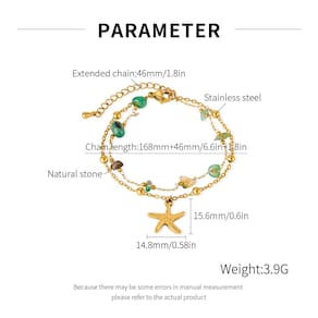 Tamanho: 168+46 mm Peso: 3,9 g Material: aço inoxidável Starfish Charm inspirado no oceano — apresenta um pingente de estrela do mar finamente detalhado combinado com pedras naturais terrosas, evocando uma atmosfera costeira arejada. Design Boho de camada dupla — O design de corrente dupla cria um efeito visual em camadas, combinando miçangas irregulares de pedras preciosas e detalhes dourados para um visual casual e chique. Construção leve e durável — Feito de aço inoxidável para uso duradouro, com um peso total de apenas 3,9 g, tornando-o confortável para uso diário. Ajuste ajustável para todos os pulsos — equipado com uma corrente extensora de 168+46 mm e fecho de lagosta para um tamanho flexível e uma fixação segura. Acessório de verão versátil — ideal para férias na praia, estilo de fim de semana ou para adicionar detalhes divertidos inspirados na natureza a roupas minimalistas.