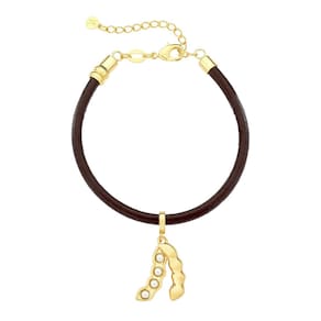 A VL accessoires traz à você a Pulseira Soja com 4 Pérolas que representam seus grãos. Elaborada em Couro Natural na cor marrom café, possui seus metais revestidos em Ouro!