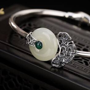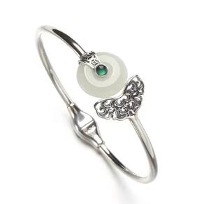 Material: prata 925 Apresenta uma peça central redonda de jade branco polido que simboliza paz, harmonia e equilíbrio interior. Projetado com um toque de borboleta esculpida em forma de borboleta oca para maior elegância e simbolismo cultural. Feito de prata esterlina 925 de alta qualidade com revestimento de platina para maior durabilidade e brilho. A estrutura de pulseira aberta permite um tamanho ajustável e um uso confortável em diferentes formatos de pulso. Ideal para mulheres que procuram um acessório refinado e significativo que combine charme vintage com artesanato moderno.