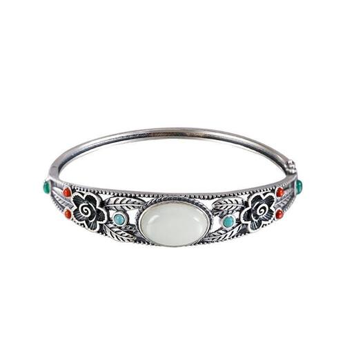 Peso: 28 g Material: prata 925 Feito de prata esterlina 925 genuína com acabamento antigo feito à mão, oferecendo durabilidade com charme atemporal. Apresenta uma peça central de jade branco polido que exala elegância e energia espiritual. Decorado com incrustações coloridas e padrões florais esculpidos que refletem artesanato étnico e detalhes artísticos. A estrutura aberta do manguito garante conforto ajustável e um ajuste seguro para vários tamanhos de pulso. Ideal para mulheres que amam acessórios vintage, boho ou de estilo étnico que se destacam com um toque cultural.