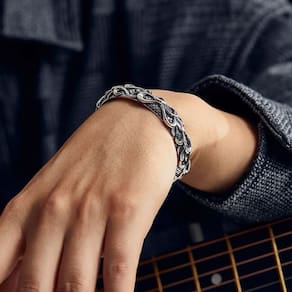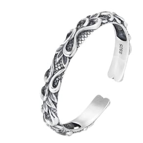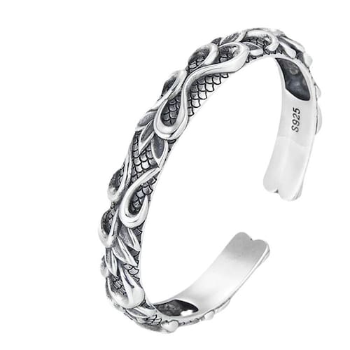 Tamanho: Largura 4,6 mm, espessura 8,7 mm Peso: 35 g Material: prata 925 Feito de prata esterlina 925 sólida com uma construção pesada de 35 g para uma sensação masculina premium. Apresenta gravuras intrincadas de ondas e escamas de peixe que simbolizam poder, proteção e energia oceânica. Polido com acabamento oxidado para aumentar a profundidade e realçar o padrão de relevo elevado. O design de manguito aberto oferece um ajuste flexível e ajustável, adequado para a maioria dos tamanhos de pulso. Perfeito para homens que apreciam joias marcantes com temas náuticos ou míticos criados com alto nível de detalhes.