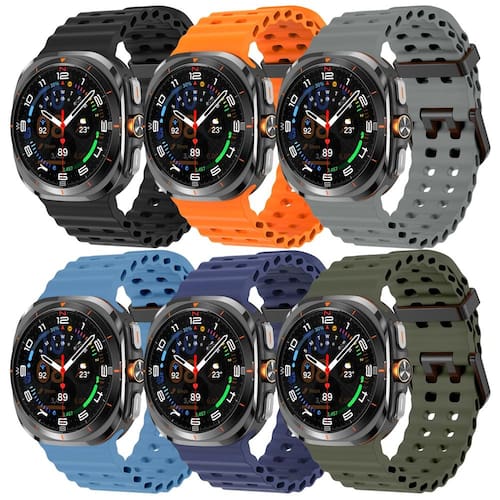 - ?Pulseiras esportivas oceânicas compatíveis com Samsung Galaxy Watch Ultra 2024?A pulseira para Galaxy Watch Ultra Water Sports foi cuidadosamente projetada para liberar todo o poder do novo Galaxy Watch Ultra. O design ondulado largo desta pulseira de relógio permite drenagem fácil e transpiração rápida, para que você possa se sentir em casa em todos os tipos de esportes.