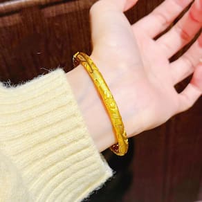 Tamanho: Largura 5,5 mm Peso: 33 g Material: Placer dourado Padrão de peônia intrincado — Decorado com elegantes esculturas de peônia que simbolizam riqueza e graça, cada flor finamente gravada para obter uma textura detalhada. Construção em placer dourado — Feito de placer dourado durável com cores ricas e duradouras e tratamento de superfície antimanchas. Sensação sólida e substancial — Pesando 33 g, esta pulseira oferece um toque premium e pesado para quem aprecia artesanato de luxo. Design aberto de 5,5 mm de largura — O estilo aberto permite fácil ajuste para caber em diferentes tamanhos de pulso, mantendo o conforto e a segurança. Apelo estético tradicional — combina motivos chineses clássicos com minimalismo moderno, ideal para casamentos, festivais ou uso diário com um toque cultural.