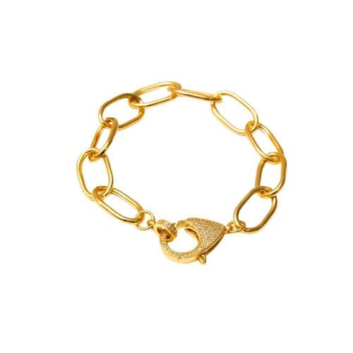 Pulseira Elos Grandes Fecho Cravejado Banhado A Ouro 18k Pulseira Elos Grandes Fecho Cravejado Banhado a Ouro 18k 22cm - Maravilhosa pulseira de elos largo, com fecho grande cravejado dos dois lados. Com a opção de fechar em qualquer elo, fica uma opção super versátil.