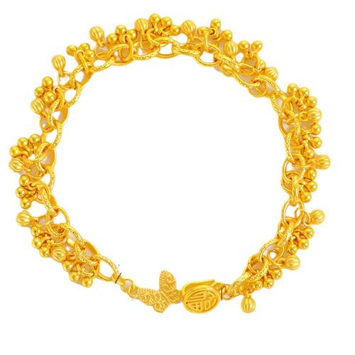 Peso: 33 g Material: Gold Placer Abundant Design inspirado em frutas — apresenta pingentes agrupados que lembram frutas maduras, simbolizando prosperidade, abundância e energia da colheita. Estilo vintage banhado a ouro — Feito com intrincados elos de corrente dourados e detalhes pendentes que refletem o artesanato tradicional com um toque luxuoso. Soft Bell Accents — Inclui pequenos pingentes em forma de sino que se movem suavemente e emitem sons sutis, adicionando apelo visual e sensorial. Fecho oriental seguro — O fecho é detalhado com motivos culturais, incluindo símbolos de borboletas e fortunas, aprimorando a identidade tradicional da pulseira. Estética exótica e espiritual — Ideal para mulheres que buscam um acessório marcante com simbolismo tradicional, adequado tanto para o estilo diário quanto para uso festivo.