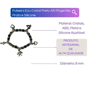 Pulseira Exu Cristal Preto AB Pingentes Prata e Silicone Pulseira Exu Cristal Preto AB Pingentes Prata e Silicone Pulseira Exu Cristal Preto AB Pingentes Prata e Silicone da Bialluz possui pedras de alta qualidade feitas de forma artesanal com muito carinho. Com tamanho único, mas muito versátil por conta do silicone, é perfeita para qualquer pessoa. Cheia de boas energias e carregada de fé nossa pulseira emanará muita paz em sua vida Enviamos a sua pulseira em até 24 horas após a confirmação de pagamento Dimensões aproximadas:Tamanho das pedras: 8 mm Por ser uma peça feita artesanalmente podem ocorrer pequenas variações nas cores ou tamanhos. Caso tenha alguma dúvida nos mande mensagem que respondemos rapidinho para te ajudar da melhor forma possível Marca: Meta Atacado