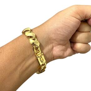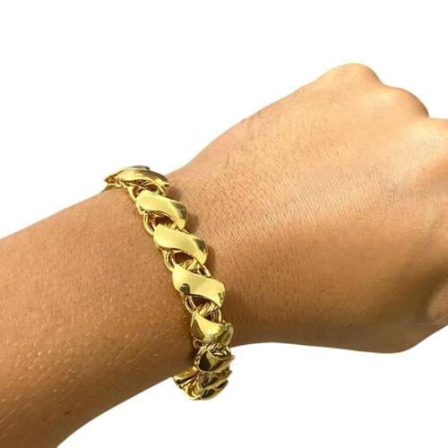 Pulseira Friso S Dupla Face 13mm Banhado a Ouro 18K 40g Detalhes do Produto: Material: ligas metálicas de alta qualidade, especialmente tratadas para fixação e absorção do ouro, com acabamento em verniz protetor. Aparência: visual idêntico ao ouro maciço. Produção: artesanal, com atenção meticulosa aos detalhes. Banho: 10 camadas espessas de ouro 18k, finalizadas com verniz antialérgico . Elos: soldados varia conforme o modelo . Pedras: zircônias brilhantes cravejadas quando aplicável . Tamanhos Disponíveis: Cordões Masculinos: 70cm padrão e 60cm sob consulta/Pedido Via Chat . Cordões Femininos: 50cm padrão e 45cm sob consulta/Pedido Via Chat . Pulseiras: 21cm padrão ; tamanhos de 18cm a 23cm sob consulta/Pedido Via Chat. Pingentes: conforme imagens; consulte para mais detalhes via chat. Espessuras Recomendadas para Cordões / Pingentes: P: 1mm a 4mm M: 4mm a 8mm G: 6mm a 13mm Gg: 12mm a 18mm Incluso na Compra: Saquinho de organza para armazenamento seguro. Caixa elegante, perfeita para presente. Cupom de desconto para a próxima compra. Flyer com outros produtos da coleção. Carta de agradecimento personalizada. Adesivo da marca ToJoia18k. Informações Adicionais: : 6 meses termos acompanham o produto . Devolução: 7 dias para devolução sem questionamentos. Envio: despacho em até 24 horas úteis após confirmação do pagamento. Cuidados com a Peça: Evite contato com produtos químicos; aguarde o perfume secar antes de usar. Evite contato com shampoo, condicionadores e suor excessivo. Armazene em local seco, preferencialmente no saquinho de organza fornecido. Uso no mar e piscina é permitido; lave com água corrente e sabão neutro após. Por que Escolher a ToJoia18k Semi-joias luxuosas que combinam estilo, qualidade e sofisticação. Banho espesso de ouro 18k, garantindo brilho duradouro e acabamento impecável. Design exclusivo e produção artesanal, perfeitos para qualquer ocasião. Materiais premium que asseguram durabilidade. Ao escolher uma semi-joia ToJoia18k, você investe em qualidade, elegância e uma experiência única. Aguardamos sua compra Observação: pode ocorrer variação no fecho raramente . Imagens reais, sem edição. Qualquer dúvida, estamos à disposição para esclarecimentos. Marca: Não Informado