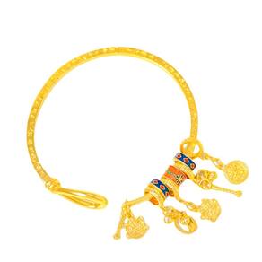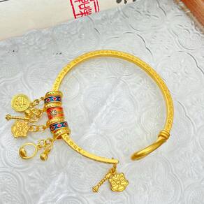 Tamanho: Largura 3,5 mm Peso: 28 g Material: Gold Placer Construção em placer dourado de alta pureza — Feita de placer dourado durável com um rico tom dourado, esta pulseira pesa 28 g e mede 3,5 mm de largura, oferecendo uma sensação premium e forte usabilidade. Detalhes tradicionais em esmalte — Apresenta detalhes coloridos de esmalte em tons vibrantes de azul, vermelho e verde que aprimoram a expressão artística e a riqueza cultural da pulseira. Amuletos da sorte simbólicos — decorados com pingentes intrincados, incluindo leões alimentares, moedas e símbolos auspiciosos que representam riqueza, proteção e energia positiva. Design de punho aberto ajustável — A pulseira em estilo pulseira inclui um fecho aberto para um ajuste flexível, projetada para facilitar o uso e a remoção sem comprometer a segurança. Estilo étnico chinês com apelo moderno — Perfeita para mulheres que apreciam a herança cultural, esta pulseira combina a nova estética chinesa com a moda moderna de joias.