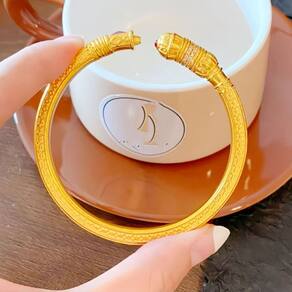Tamanho: Diâmetro do talão 6,8-8,3 mm Peso: 47 g Material: Gold Placer Royal Scepter Design inspirado no cetro — As pontas ousadas da pulseira são desenhadas na forma de cetros antigos, simbolizando poder e nobreza na tradição imperial chinesa. Detalhes vibrantes de gemas vermelhas — Apresenta impressionantes incrustações de pedras preciosas vermelhas combinadas com cristais cintilantes, adicionando profundidade e sofisticação aos detalhes ornamentados. Placer dourado de alta qualidade — Feito de ouro placer fino usando técnicas tradicionais de ouro arenoso para obter um acabamento fosco, inspirado na tradição, rico em textura. Ajuste aberto — A pulseira semiflexível de ponta aberta oferece um ajuste confortável e é fácil de colocar ou remover sem comprometer a estrutura. Peça marcante para mulheres modernas — Uma mistura única de simbolismo cultural e luxo, ideal para ocasiões formais, cerimônias ou moda diária ousada.