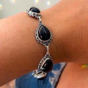 Pulseira Gotas Pedra Onix Prata De Bali 925 Pulseira Gotas Pedra Onix Prata de Bali 925 19cm - Pulseira Gotas Pedra Onix Prata de Bali 925 Pulseira feminina em Prata de Bali 925 com pedras naturais de Ônix lapidadas em formato de gota. Com 1,4 cm de largura, essa joia é perfeita para quem busca elegância com significado. O Ônix é uma pedra associada à proteção, força e estabilidade emocional ideal para afastar energias negativas e fortalecer o espírito. Seu tom preto intenso contrasta lindamente com os detalhes artesanais em prata, criando uma peça marcante, sofisticada e cheia de personalidade.