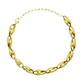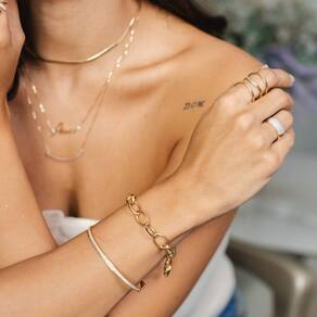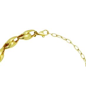 A pulseira possui 22,5 cm, que foi cuidadosamente feita em uma forma sofisticada e geométrica, adicionando uma dose de elegância à peça. A tonalidade do ouro confere um charme sutil e um brilho delicado que o destaca em qualquer ocasião.