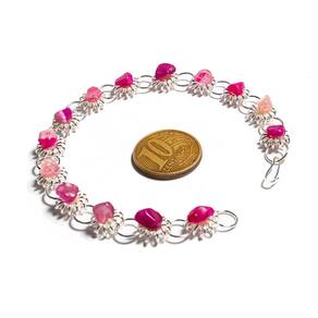 Pedra: Ágata Rosa Rolada (Pedra Natural e Autêntica) Design: Arco delicado em forma de margarida com pedra colada no topo, destacada por metal prateado de alta qualidade. Brilho: Alto brilho, proporcionando um visual elegante e encantador. Tamanho da Pulseira: 19,3 cm (tamanho ajustável para se adaptar confortavelmente ao seu pulso) Tamanho da Pedra: 4 x 6 mm (aproximadamente) Cor da Pedra: Rosa (foto ilustrativa) Material: Metal prateado e pedras genuínas, garantindo resistência e durabilidade.