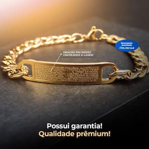 O pingente distinto, com 4,5 cm de comprimento e 1 cm de largura, apresenta a oração do Pai Nosso gravada de forma sutil, tornando esta pulseira mais do que apenas um acessório, mas sim uma expressão significativa de fé e estilo.