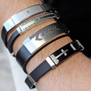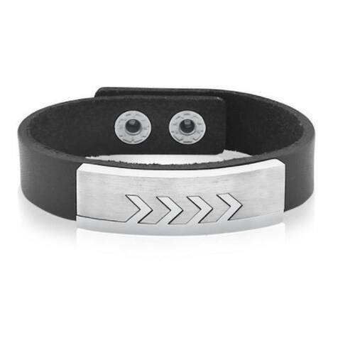 Pulseira Masculina de Couro com Placa Curva Trabalhada em Aço. Use Acessórios Masculinos, faça composições com outras pulseiras e dê um Up no Look