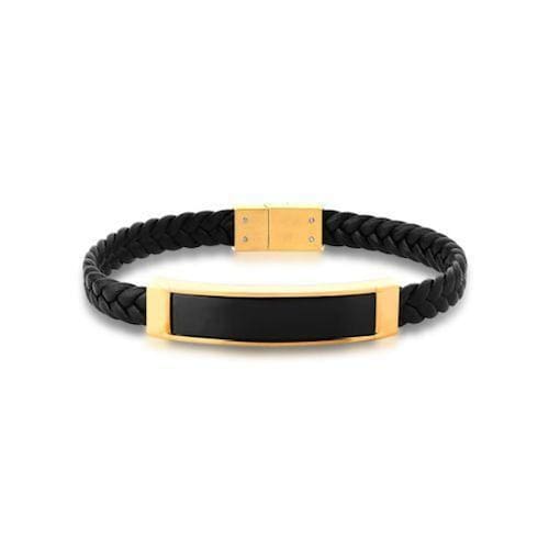 Pulseira Masculina Courino Preto E Placa Negra Em Aço Dourado Pulseira Masculina Courino Preto trançado e Placa Curva Negra e Dourado, linda e ideal para usar com outra Pulseira. Use Acessórios Masculinos e dê um Up no Look