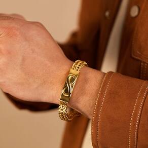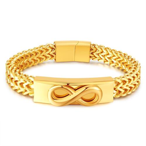 Tamanho: 21 x 0,9 cm Peso: 56 g Material: aço inoxidável Bold Infinity Symbol Design — Apresenta um motivo em relevo em forma de oito que simboliza força ilimitada e estilo atemporal, adicionando detalhes icônicos à placa central. Fecho magnético — Equipado com um fecho magnético forte e seguro para facilitar o uso e a remoção, mantendo uma silhueta limpa. Apelo estético de streetwear — Com seu acabamento dourado e corrente de tecido resistente, esta pulseira oferece uma atmosfera inspirada no hip hop, ideal para o estilo urbano. Construção confortável em corrente — A pulseira com padrão chevron é lisa no pulso, mas visualmente texturizada, aumentando o conforto e a ousadia. Construção em aço inoxidável pesado — Pesando 56 g, esta pulseira é feita de aço inoxidável de alta qualidade que resiste ao desbotamento, ferrugem e desgaste.