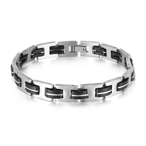 Tamanho: 21,5 x 1 x 0,24 cm Peso: 27 g Material: aço inoxidável Design de corrente inspirado no punk — Apresenta uma corrente segmentada ousada com incrustações pretas, oferecendo um forte estilo industrial para a moda urbana moderna. Construção em aço inoxidável — Feita com aço inoxidável de alta qualidade que resiste à ferrugem, manchas e arranhões para proporcionar durabilidade e desgaste duradouros. Acabamento escovado fosco — A superfície é polida com uma textura escovada para uma aparência elegante e robusta que aprimora sua estética punk. Confortável e leve — pesando 27 g e dimensionada para um ajuste natural no pulso, esta pulseira oferece conforto durante todo o dia sem sacrificar a presença. Fecho dobrável seguro — equipado com um fecho firme que garante que a pulseira permaneça no lugar durante atividades diárias ou movimentos casuais.
