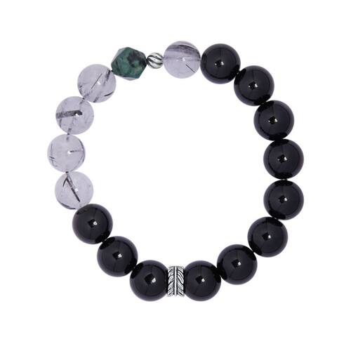 Tamanho: Diâmetro do cordão 10 mm Peso: 35 g Material: obsidiana Obsidiana natural e quartzo rutilado — Possui contas de obsidiana preta polida de 10 mm combinadas com quartzo translúcido embutido com fios de rutilo preto, combinando poder e elegância sutil. Miçanga decorativa em prata S925 — acentuada com um pingente minimalista de prata esterlina S925, adicionando um caráter vintage refinado e artesanato premium à pulseira. Estética elegante e masculina — O preto profundo e os tons esfumaçados, aprimorados pelo contraste geométrico e pela prata fina, fazem desta a escolha perfeita para homens que preferem acessórios ousados e discretos. Design de cordão elástico durável — amarrada à mão em um elástico forte, esta pulseira oferece um ajuste seguro e flexível para a maioria dos tamanhos de pulso, mantendo sua forma e equilíbrio. Moderno e focado na energia — Ideal para homens que buscam equilíbrio, clareza ou energia fundamental, além de usar guarda-roupas minimalistas, urbanos ou de inspiração espiritual.
