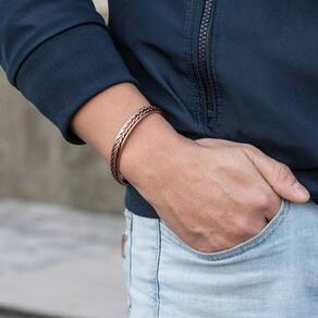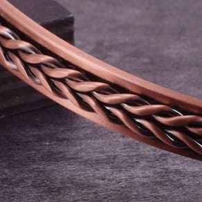Circunferência: 18cm Esta pulseira traz qualidades que vão além do charme e elegância.Além de ter um design estiloso, clássico e luxuoso, ela possui propriedades benéficas à saúde, por ser magnética.Ela possui ao todo 6 imãs magnéticos de neodímio de 2500 gauss, que juntos promovem a terapia magnética, que tem sido utilizada há anos, com o objetivo de ajudar a aliviar a dor, reduzir inflamações e melhorar a circulação sanguínea.O magnetismo na pulseira age através dos imãs de neodímio e contribuem para a redução do estresse e ansiedade, melhora do sono e do humor.Nas mulheres, ajuda a aliviar cólicas e desconfortos.---------------Características: pulseira cura terapia magnética cobre e neodímio 2500 gaussMaterial: CobreCor: CobreTamanho: AjustávelDiâmetro: 75mmLargura: 9mmElementos: 6 imãs de neodímio 2500 GaussIdeal para ser usada em punhos de 18cm a 21cm 18cm folgada, com caimento no punho21cm justa, sem caimento no punho---------------Cuidados Com o Produto:Evite contato com gel de cabelo, perfume e substâncias ácidas;Não entre na água com sua pulseira, pois os imãs correm risco de sofrer oxidação;Evite usá-la em atividades que produzem muito suor.