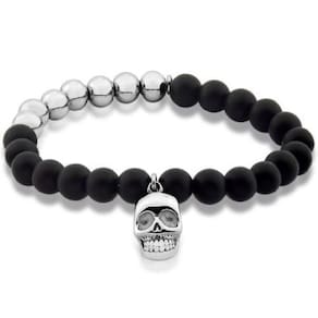 Pulseira Masculina Pedra Vulcânica, Pingente Caveira em Aço e Cordão de Silicone ajustando facilmente ao braço. Use Acessórios Masculinos e dê um up no Visual