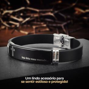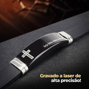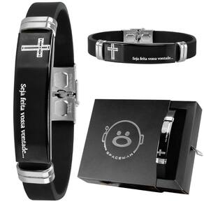 Pulseira masculina placa aço inox pai nosso caixa qualidade premium silicone preto presente social Pulseira Masculina Pai Nosso Ajustável - 21cm de comprimento