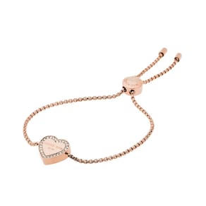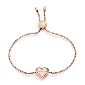 Michael Kors Pulseira feminina em tom de ouro rosa; pulseiras; joias femininas, Aço inoxidável - A coleção de joias Michael Kors é projetada para um apelo atemporal. Feita de materiais hipoalergênicos como aço inoxidável e latão com detalhes brilhantes, ricos em detalhes com qualidade duradoura. - Um presente perfeito para aquela pessoa especial, esta linda pulseira deslizante da Michael Kors Jewelry vem com um pingente de coração polido em tom de ouro rosa com auréola de cristal pavé. - Esta pulseira de corrente possui aço inoxidável em tom de ouro rosa e um fecho deslizante ajustável. - Diâmetro interno 5,7 cm - Tipo de fecho: Slider - Acabamento: Polido