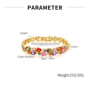 Tamanho: 19,5 x 1,1 cm Peso: 21 g Material: aço inoxidável Enfeites coloridos de pedras preciosas — Adornados com várias formas e cores de pedras, incluindo vermelho, rosa, roxo e verde oliva, oferecendo uma estética vibrante e elegante. Corrente texturizada em estilo europeu — O design de elos incorpora elementos abertos em forma de coração, adicionando profundidade e personalidade à estrutura geral da pulseira. Acabamento em tom dourado polido — Galvanizado em um tom dourado de alto brilho que resiste ao desbotamento e melhora a vivacidade dos cristais embutidos. Ajuste confortável e leve — Com um comprimento total de 19,5 cm e um peso de 21 g, esta pulseira oferece uma sensação equilibrada para conforto durante todo o dia sem sacrificar o estilo. Mecanismo de fecho seguro — Possui um fecho de caixa reforçado que prende a pulseira com segurança no lugar, ideal para festas, roupas noturnas ou roupas de moda casual.