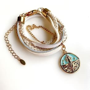 Pulseira com pingente iemanjá com resina glitter azul celeste. Um poderoso amuleto da mãe das águas. Diâmetro pingentel: 26mm Pulseira feita com 3 tiras de couro diferentes, corrente , pingente de signo com fecho mosquetão com desenho de coração, banhadas a ouro amarelo 18k e corrente extensora . Pode ser Utilizado tambem como gargantilha ou chocker Tamanho total da pulseira: 35 cm de comprimento + 5 cm de extensor Tamanho do pingente: 16,00mm de diâmetro x 2,40 de espessura. Tipo de couro: achatado e trançado, natural e sintético Metal base do fecho, entremeios e pingente: zamaque de 3 meses no banho e cravação das pedras mediante a defeitos de fabricação e não mau uso pelo cliente Caso aconteça um desgaste do banho, mudança de coloração, a peça será submetida a teste para averiguar se foi problema de fabricação ou mau uso. Nosso banho é denominado hipoalergênico pois não contém niquel na composição Marca: Não Informado