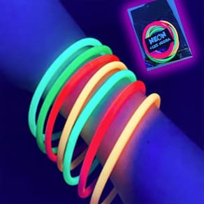 Produto em plástico que contém em seu interior um líquido reativo para dar brilho. Tamanho aproximado de cada pulseira: 20 cm.