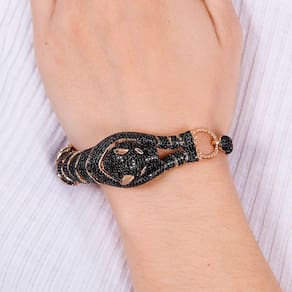 Pulseira em formato de pantera negra inteira é uma semijoia banhada a ouro, cravejada de zircônias pretas, luxuosa e que te deixa em destaque em qualquer situação.
