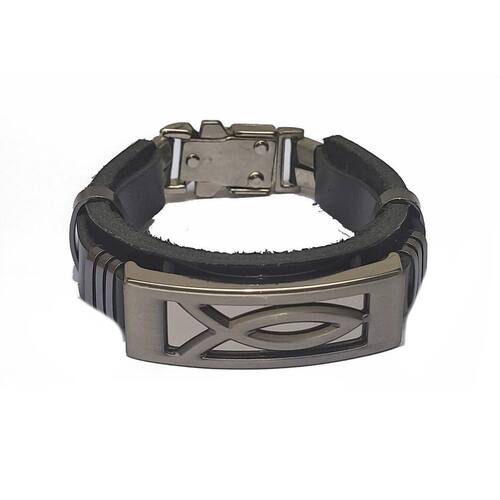 Desfrute de uma pulseira de baixo custo espiritualmente inspiradora . Esta pulseira de couro preto apresenta uma peça central em aço inoxidável de dois tons com um peixe e um desenho de Menorá e Estrela de David.