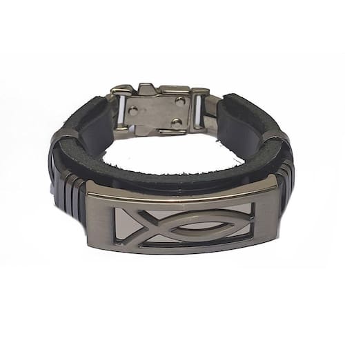 Graça e Paz Somos da MARANATA SHOFAR vendemos Shofar, Talits, Candelabros Menorah, kipá, chaveiros, castiçais, torah, além de diversos itens importados de Israel e produtos nacionais. DESCRIÇÃO DO PRODUTO -01 pulseira em material sintético com partes em metal prata. Contém 22 cm em linha reta. Desfrute de uma pulseira de baixo custo espiritualmente inspiradora . Esta pulseira de couro preto apresenta uma peça central em aço inoxidável de dois tons com um peixe e um desenho de Menorá e Estrela de David. Prendedor confortável. - Pulseira de borracha bonita de baixo custo - Placa de cor dourada no centro - Fecho de metal fácil de fechar Marca: Holy Land Ean: 7905615245798