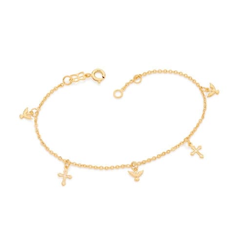 Pulseira Rommanel Espíritos Santos e Cruzes Folheada a Ouro 18k A Pulseira Rommanel Espíritos Santos e Cruzes Folheada a Ouro 18k é uma joia de alta qualidade e durabilidade, perfeita para quem busca sofisticação e elegância. Composta por fio elo cadeado oval batido, essa pulseira possui 3 espíritos santos e 2 cruzes penduradas, que dão um toque especial e religioso à peça. Com um comprimento de 19 cm ajustável até 18 cm, essa pulseira se adapta perfeitamente ao seu pulso, proporcionando conforto e segurança ao usar. Além disso, a Pulseira Rommanel Espíritos Santos e Cruzes é completamente antialérgica, livre de níquel e Cinza, o que a torna adequada para pessoas com pele sensível ou ácido úrico. A folheagem a ouro 18k dessa pulseira garante uma camada de ouro significativamente mais espessa, resultando em um visual semelhante a joias de ouro maciças. Além disso, a folheagem a ouro torna a peça muito mais resistente em comparação com outras semijoias, mantendo a cor e o brilho inalterados ao longo do tempo. A Rommanel é uma marca reconhecida nacional e internacionalmente em mais de 40 países, com mais de 30 anos de liderança no mercado de folheados a ouro. Todas as joias da Rommanel possuem acabamento artesanal de alta qualidade, garantindo a excelência em cada detalhe. Ao adquirir a Pulseira Rommanel Espíritos Santos e Cruzes, você receberá a joia perfeitamente embalada e protegida, acompanhada do certificado de oficial da Rommanel. Garanta já a sua Pulseira Rommanel Espíritos Santos e Cruzes Folheada a Ouro 18k e desfrute da beleza e qualidade que só a Rommanel pode oferecer! Marca: Não Informado