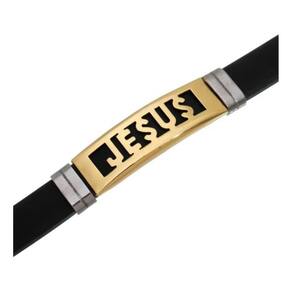 O destaque da pulseira é o pingente central, que apresenta uma fina camada de metal dourado. Este pingente exibe uma representação detalhada de Jesus, conferindo à peça um caráter espiritual e significativo. O acabamento dourado adiciona um toque de sofisticação, criando um contraste visual impressionante com o silicone.