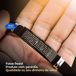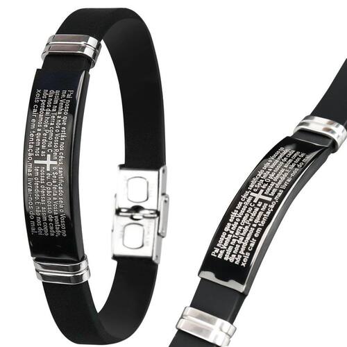 Pulseira Silicone Placa Oração Pai Nosso Preta Masculina Casual Moda Masculina Social Pulseira Masculina Ajustável com Oração Pai Nosso - Expressão de Estilo com Significado
