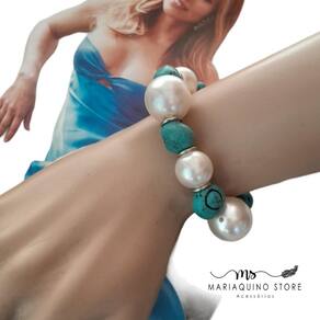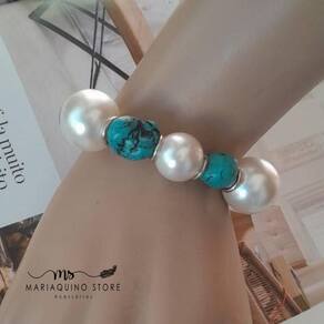 Uma pulseira linda com detalhes em pérolas e pedras turquesa. Dá um charme todo especial a composição e estilo da peça.