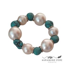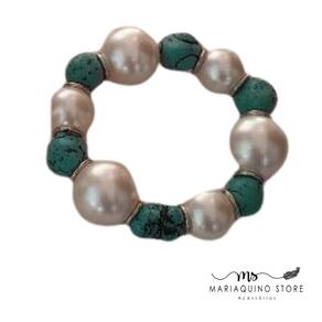 Materiais : Pérolas de abs na cor branco off de alta qualidade. Pedras turquesas verdadeiras Desenvolvida em elástico de silicone de 10mm super resistente. Argolas em metal na cor prateada.