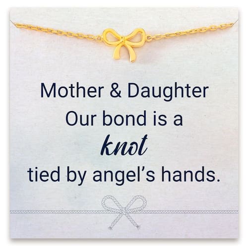 - MENSAGEM DO CARTÃO: Mãe e filha, nosso laço é um nó amarrado pelas mãos do anjo. Sem dúvida, esta pulseira de laço é um presente verdadeiramente único para mãe e filha. É também um presente de Natal ideal para mãe da filha, bem como presentes de aniversário para filha da mãe.