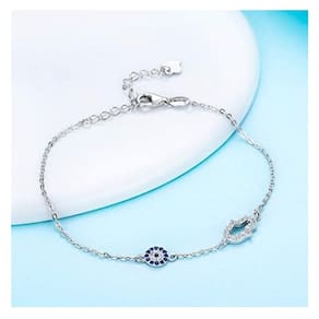 Hermosa pulsera ojo turco y manoplata 925 con protección de electro platinado en rodioPara usar en cualquier ocasión, Ideal para regalar.Largo pulsera ajustable.Anti alergia, libre de niquel, no contaminan.Fácil de mantener y limpiarInstrucciones de limpieza: Limpiar con paño pulidor de joyas de plata, pelo menos uma vez por semana para manter a alegria brilhante e evitar que se deterioreRecomendación de uso:No use los productos de plata en playas, piscinas, duchas, ya que el agua contenha cloro u otros minerales que afectan la apariencia de las joyas.Caja de presente incluído