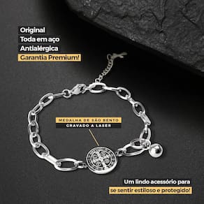 - Material Premium: Confeccionada em aço inoxidável de alta qualidade, resistente à oxidação e durável. - Tamanho Ajustável: Comprimento de 25 cm, ideal para qualquer tamanho de pulso. - Design e Significado: Sofisticada, moderna e com propósito espiritual. - Pingente Medalha de São Bento: Gravação a laser precisa e duradoura, simbolismo de proteção e bênção. - Conservação: Evitar contato com produtos químicos agressivos para preservar o brilho.