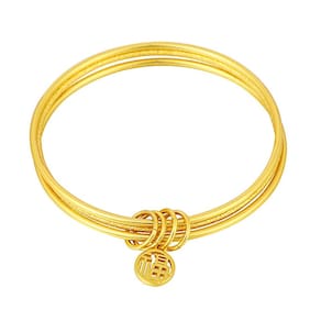 Tamanho: Diâmetro 60 mm Material: Gold PlacerTriple Coil Design — Esta pulseira apresenta uma estrutura de bobina exclusiva de três camadas, aprimorando a profundidade visual e criando um elegante efeito de empilhamento no pulso. Acabamento em ouro vietnamita — Revestida com lustroso marcador dourado, a pulseira oferece um brilho radiante e elegante que complementa as roupas tradicionais e modernas. Símbolo da Fortuna — Inclui um amuleto gravado com o caractere chinês “” (que significa fortuna), tornando-o um acessório significativo para energia positiva e inspiração diária. Liga de cobre durável — Feita de liga de cobre de alta qualidade para maior durabilidade e conforto, a pulseira é resistente ao desgaste e projetada para uso a longo prazo. Versátil e elegante — Adequada para uso diário ou ocasiões formais, esta pulseira é perfeita para mulheres que apreciam designs de joias refinados, culturais e contemporâneos.