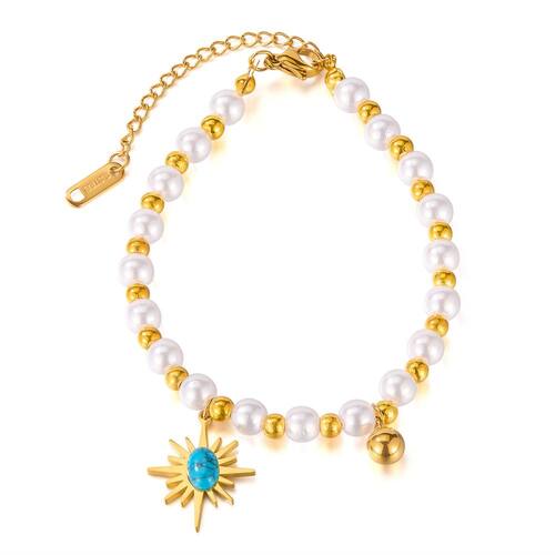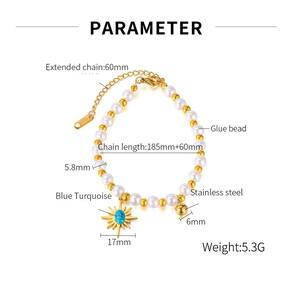Tamanho: 5,8 x 185+60 mm Peso: 6 g Material: aço inoxidável/pérola Elegant Pearl & Gold Beads — apresenta pérolas brancas alternadas e miçangas douradas polidas para uma aparência refinada e atemporal. Toque turquesa exclusivo — A atraente pedra turquesa incrustada em um pingente Starburst adiciona um toque criativo e artístico. Aço inoxidável de alta qualidade — Feito de aço inoxidável durável, resistente ao desbotamento e manchas para um brilho duradouro. Corrente de extensão ajustável — Equipada com um extensor de 60 mm para se adequar a diferentes tamanhos de pulso para um ajuste confortável. Estética francesa chique — acessório perfeito para roupas românticas, vintage ou minimalistas; adequado para encontros, jantares ou elegância casual.
