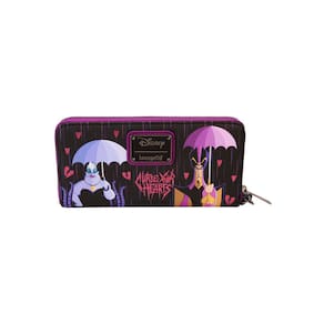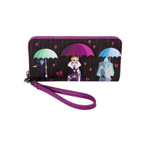 - A pulseira tipo carteira Loungefly Disney Villains Curse Your Hearts com zíper é feita de couro vegano (poliuretano). Carteira com zíper fechado com ferragens cor de metal. Os recursos adicionais incluem apliques, detalhes gravados, bordados, em papel alumínio e impressos. Anote a coordenação do revestimento interno.