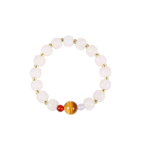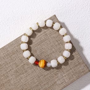 Material: jade branco Elegant White Jade Beads — apresenta contas de jade branco lisas em forma de abóbora combinadas com espaçadores dourados, adicionando charme refinado e uma sensação de serenidade cultural. Pedras de destaque simbólico — Destacadas por detalhes em pedras preciosas multicoloridas, incluindo olho de tigre, ágata vermelha e contas em estilo ametista, representando fortuna, vitalidade e paz. Design de inspiração cultural — Projetado em uma estética chinesa moderna com elementos extraídos de bênçãos tradicionais e simbolismo auspicioso, ideal para roupas espirituais ou de moda. Leve e confortável — compacta e elegante, esta pulseira é adequada para uso diário, empilhar ou combinar com outros acessórios minimalistas ou espirituais. Ajuste flexível e seguro — Construído em cordão elástico para um ajuste confortável e adaptável, facilitando o uso e a remoção em vários tamanhos de pulso.
