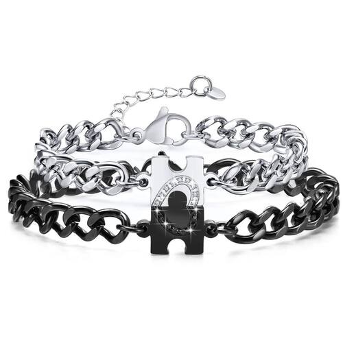 - Pulseiras combinando para casal: estas pulseiras de casal apresentam um design exclusivo de peça de quebra-cabeça. Quando as duas pulseiras se juntam, as peças do quebra-cabeça se encaixam perfeitamente, formando uma forma completa de coração. E há zircônia cúbica AAA nos pingentes das pulseiras.